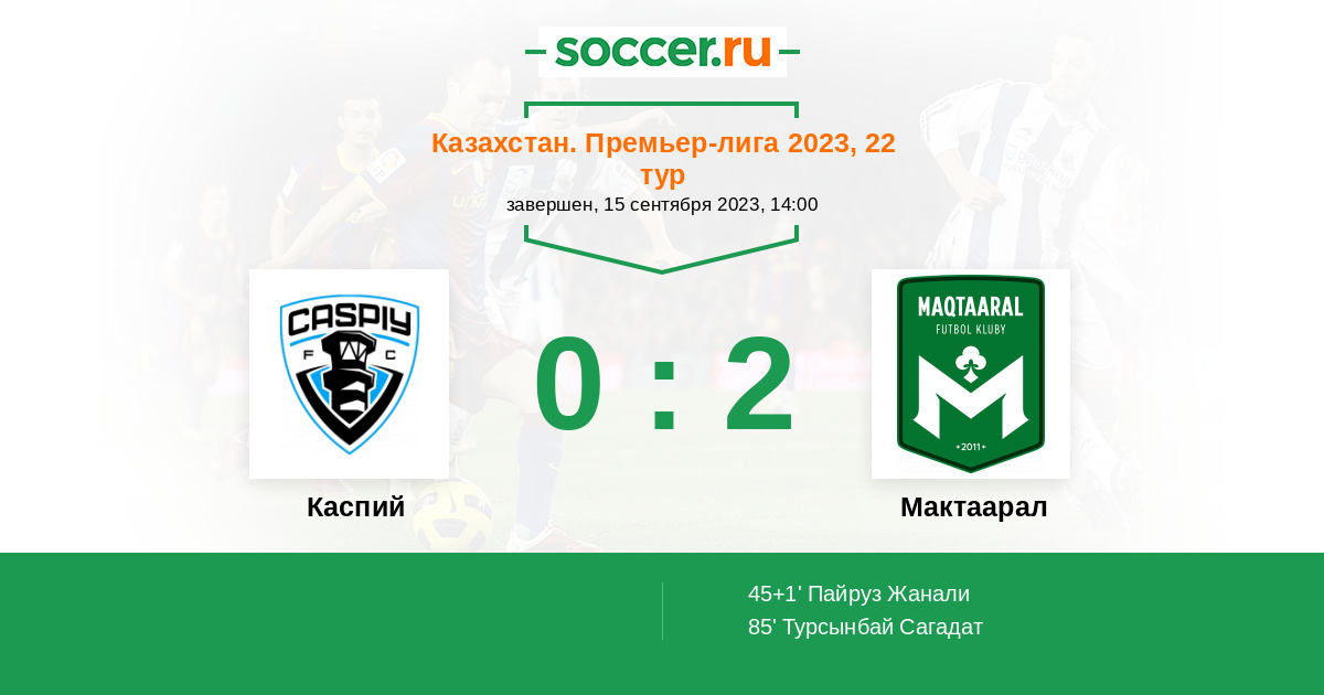 Казахстан. Премьер-лига 14.10.2022 Каспий Логотип футбольный клуб Каспий (Актау) 2:4 Логотип футбольный клуб Мактаарал (Атакент) Мактаарал