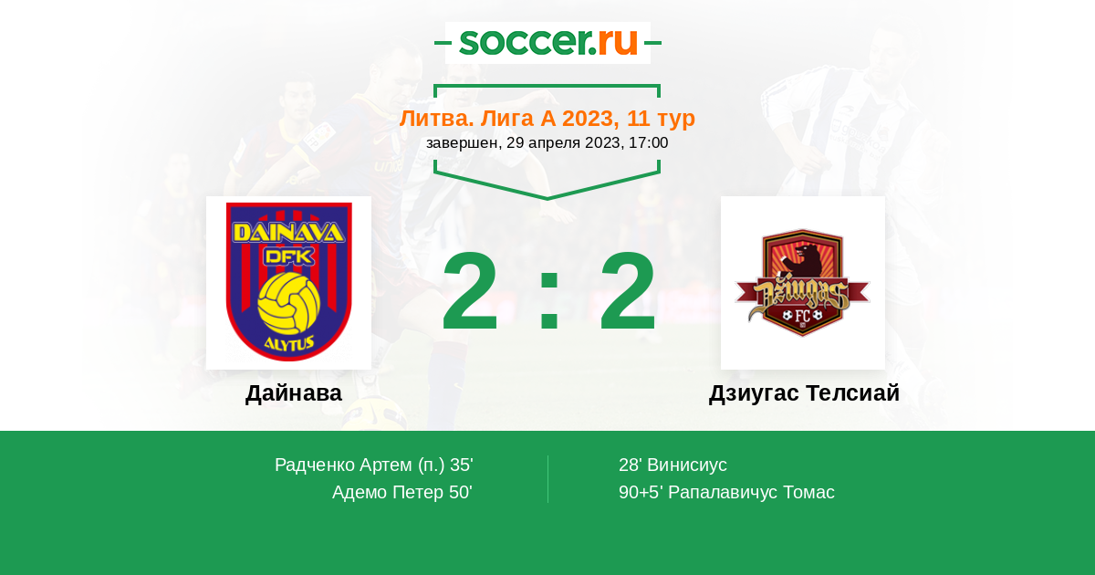 Литва. Лига А 02.05.2024 Дзиугас Телсиай Логотип футбольный клуб Дзиугас Телсиай (Тельшай) 2:1 Логотип футбольный клуб Дайнава (Алитус) Дайнава
