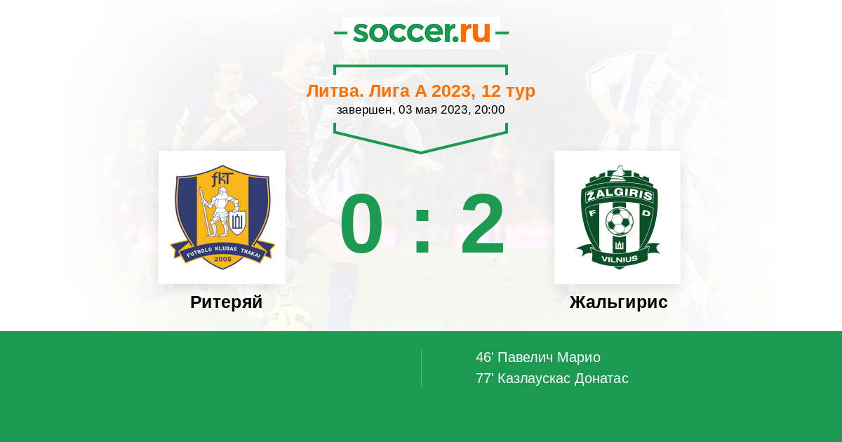 Литва. Лига А 20.03.2022 Жальгирис Логотип футбольный клуб Жальгирис (Вильнюс) 2:0 Логотип футбольный клуб Ритеряй (Тракай) Ритеряй