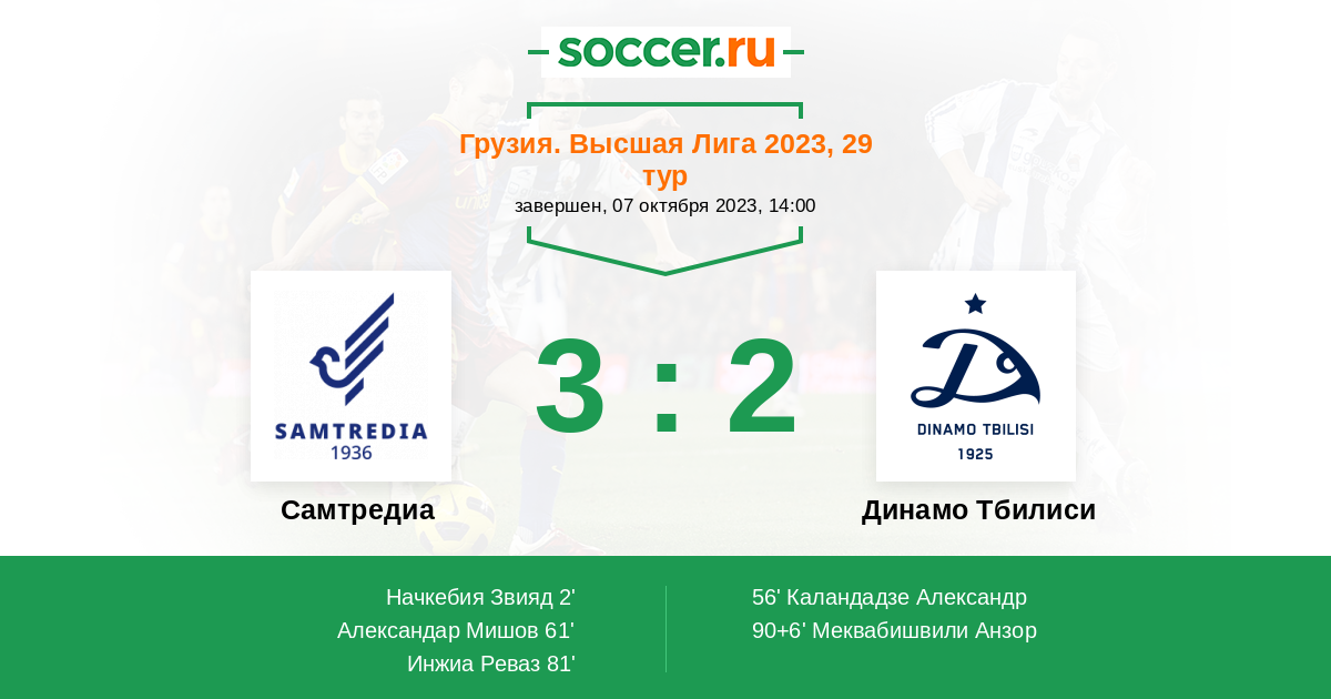 Грузия. Высшая лига 30.04.2023 Самтредиа Логотип футбольный клуб Самтредиа 0:2 Логотип футбольный клуб Динамо Тбилиси Динамо Тбилиси