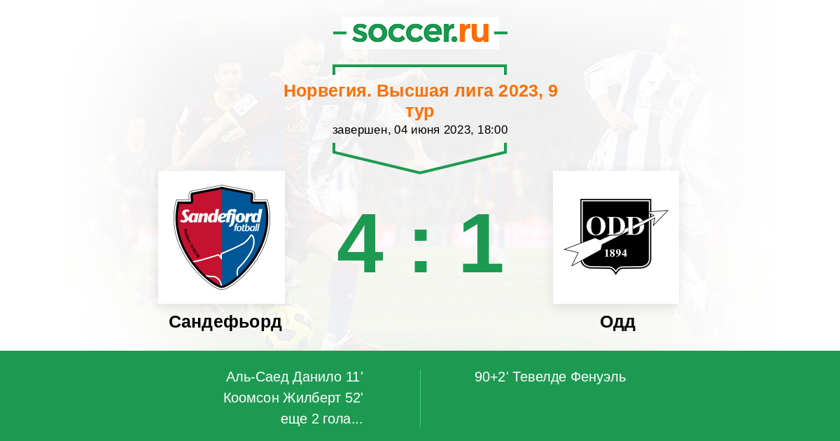 Норвегия. Высшая лига 16.06.2020 Одд Логотип футбольный клуб Одд (Шиен) 1:2 Логотип футбольный клуб Сандефьорд Сандефьорд