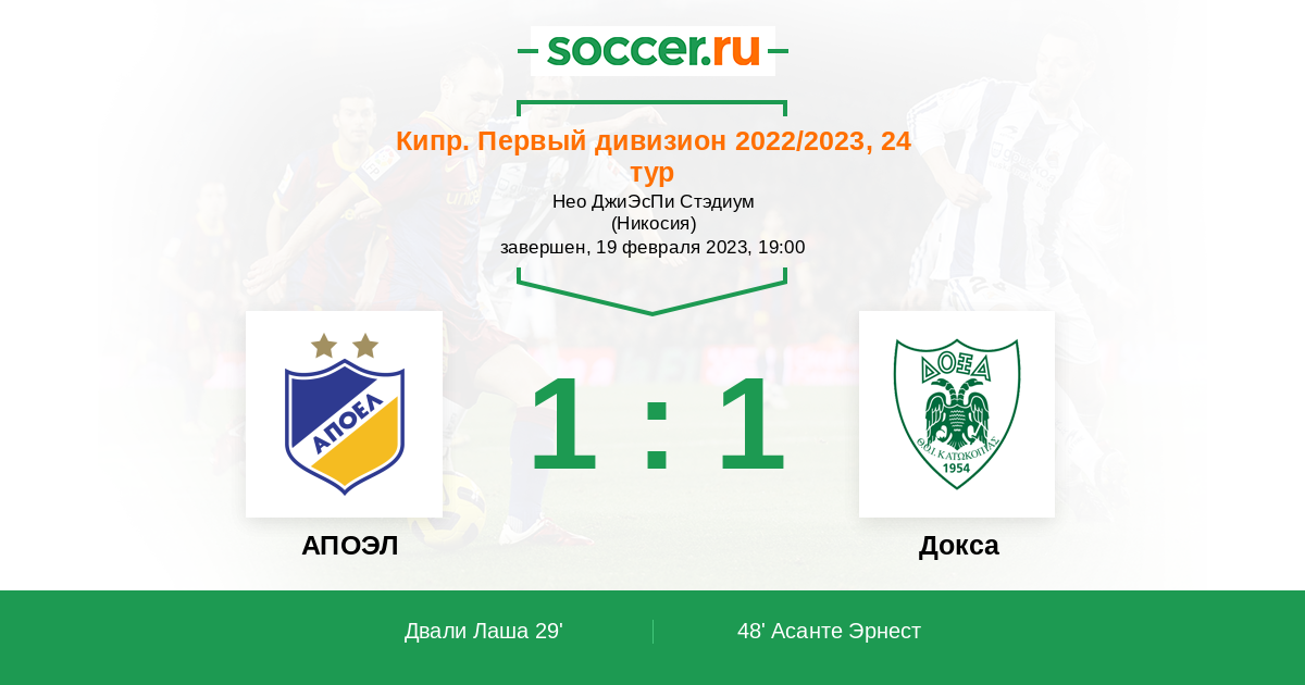 Кипр. Первый Дивизион 30.10.2021 Докса Логотип футбольный клуб Докса (Катокопиас) 2:2 Логотип футбольный клуб АПОЭЛ (Никосия) АПОЭЛ
