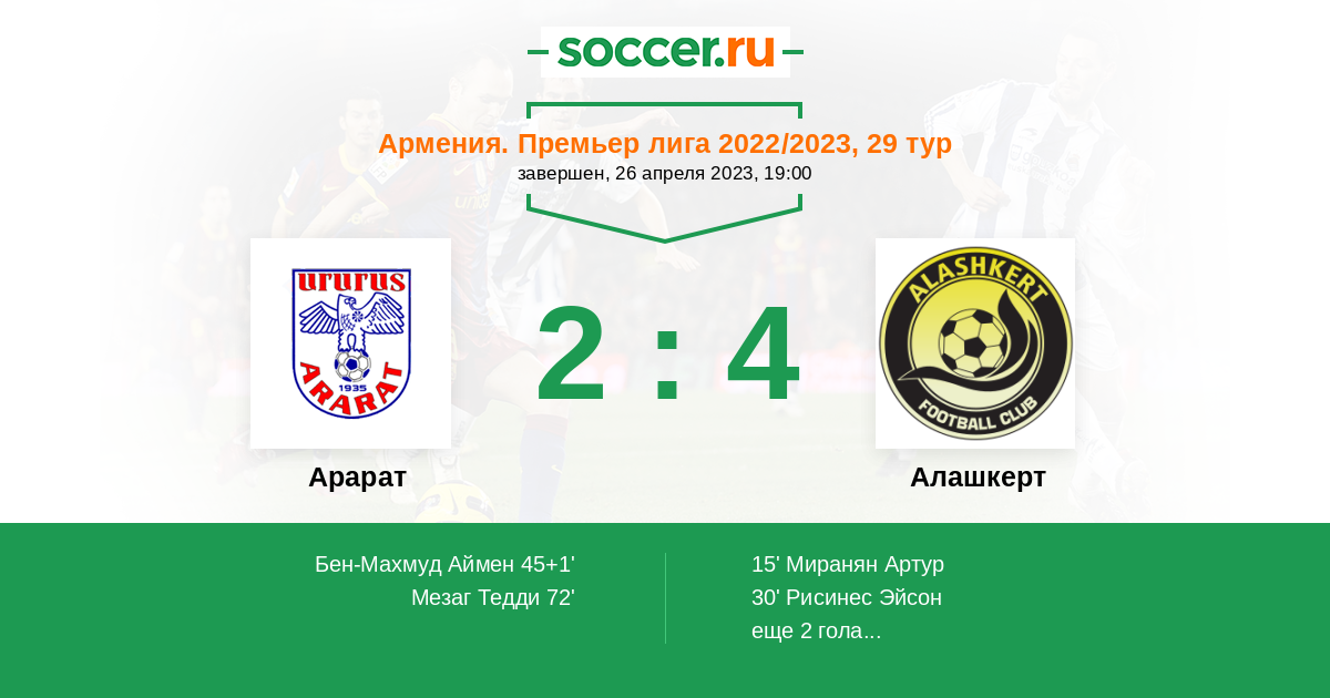 Армения. Премьер-лига 03.08.2014 Алашкерт Логотип футбольный клуб Алашкерт (Мартуни) 3:2 Логотип футбольный клуб Арарат (Ереван) Арарат