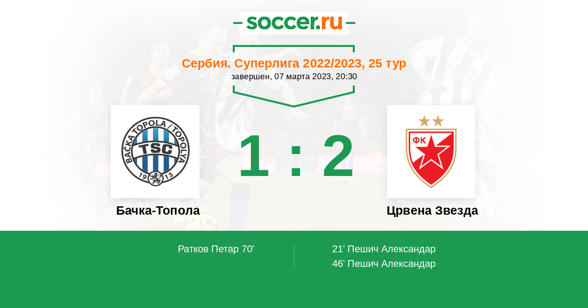 Сербия. Суперлига 22.04.2023 Црвена Звезда Логотип футбольный клуб Црвена Звезда (Белград) 4:1 Логотип футбольный клуб Бачка-Топола Бачка-Топола