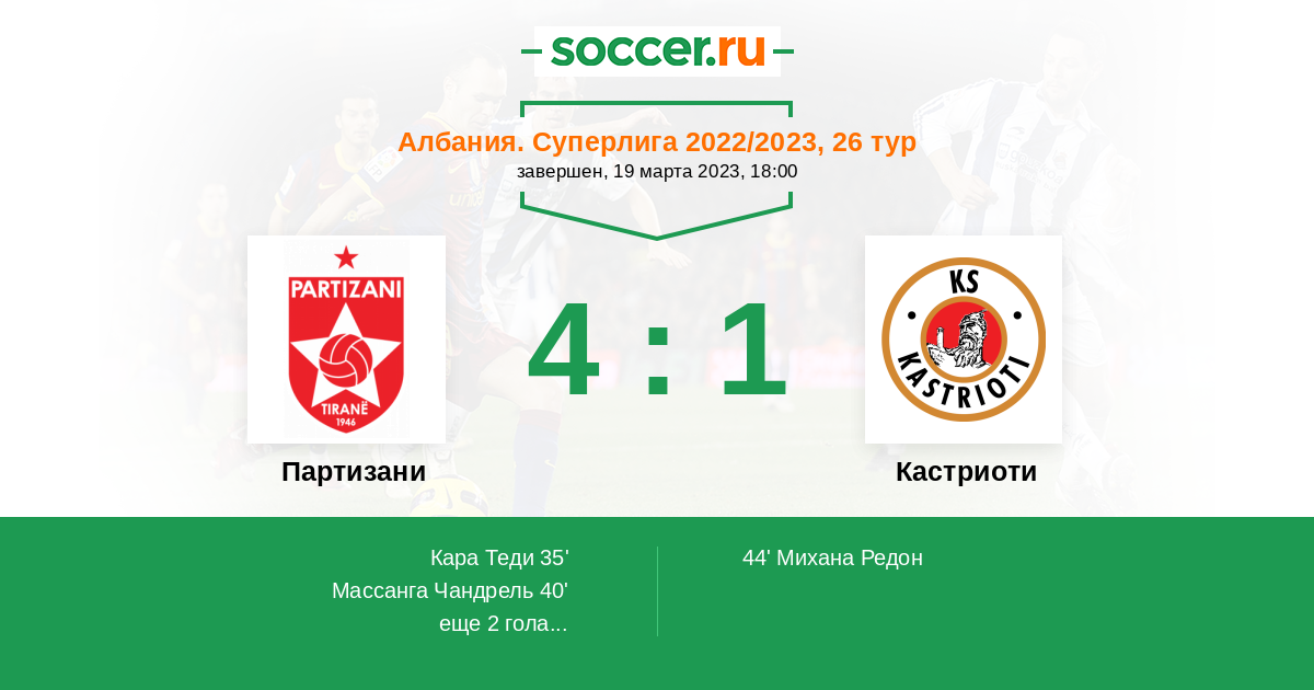 Албания. Суперлига 19.03.2022 Кастриоти Логотип футбольный клуб Кастриоти (Круже) 1:0 Логотип футбольный клуб Партизани (Тирана) Партизани