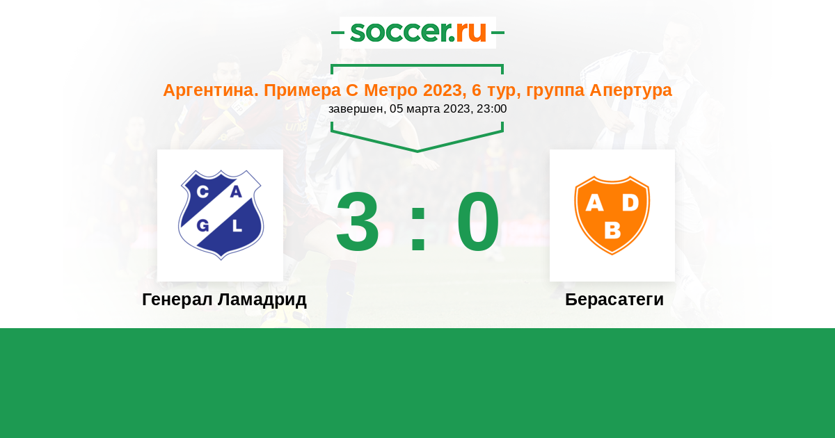 Аргентина. Примера С Метро 23.03.2024 Генерал Ламадрид Логотип Генерал Ламадрид (Буэнос-Айрес) 2:3 Логотип футбольный клуб Берасатеги (Буэнос-Айрес) Берасатеги