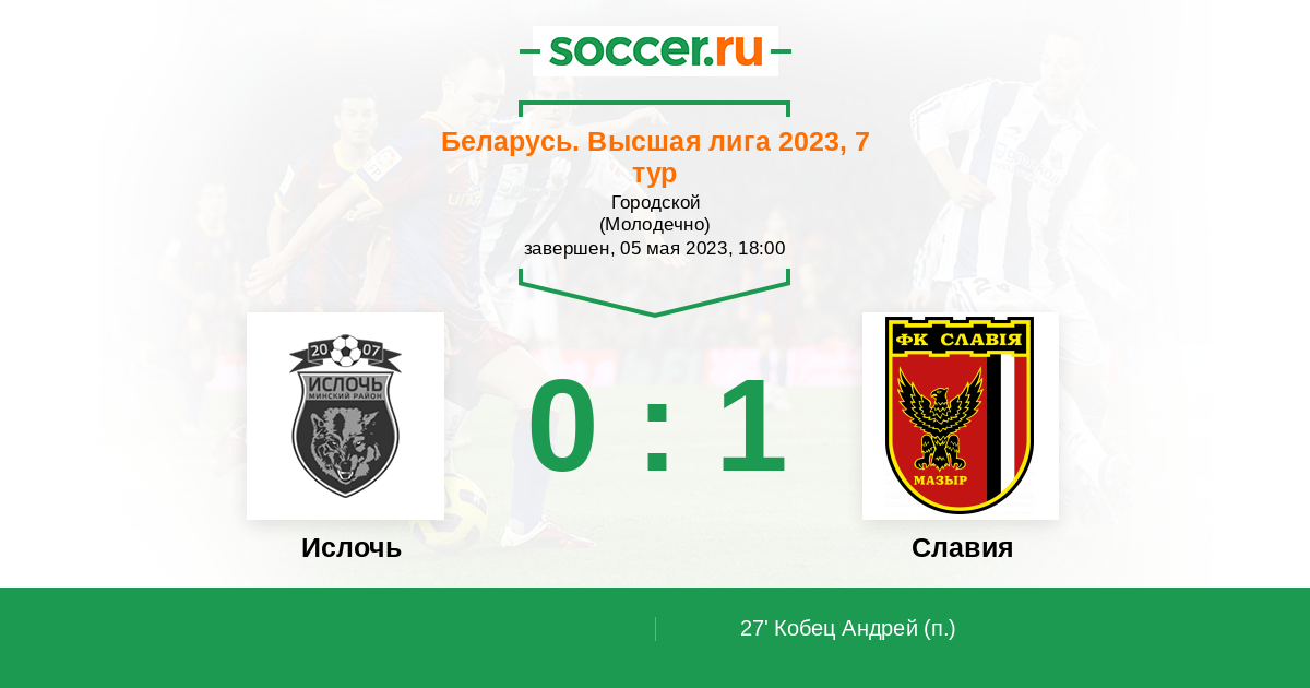 Беларусь. Высшая лига 07.07.2019 Ислочь Логотип футбольный клуб Ислочь (Минск) 2:1 Логотип футбольный клуб Славия (Мозырь) Славия