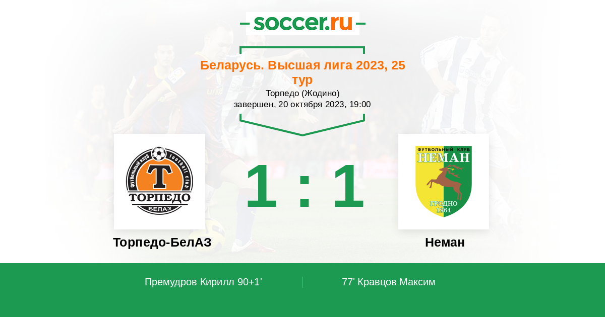 Беларусь. Высшая лига 04.10.2025 Неман Логотип футбольный клуб Неман (Гродно) 1:1 Логотип футбольный клуб Торпедо-БелАЗ (Жодино) Торпедо-БелАЗ