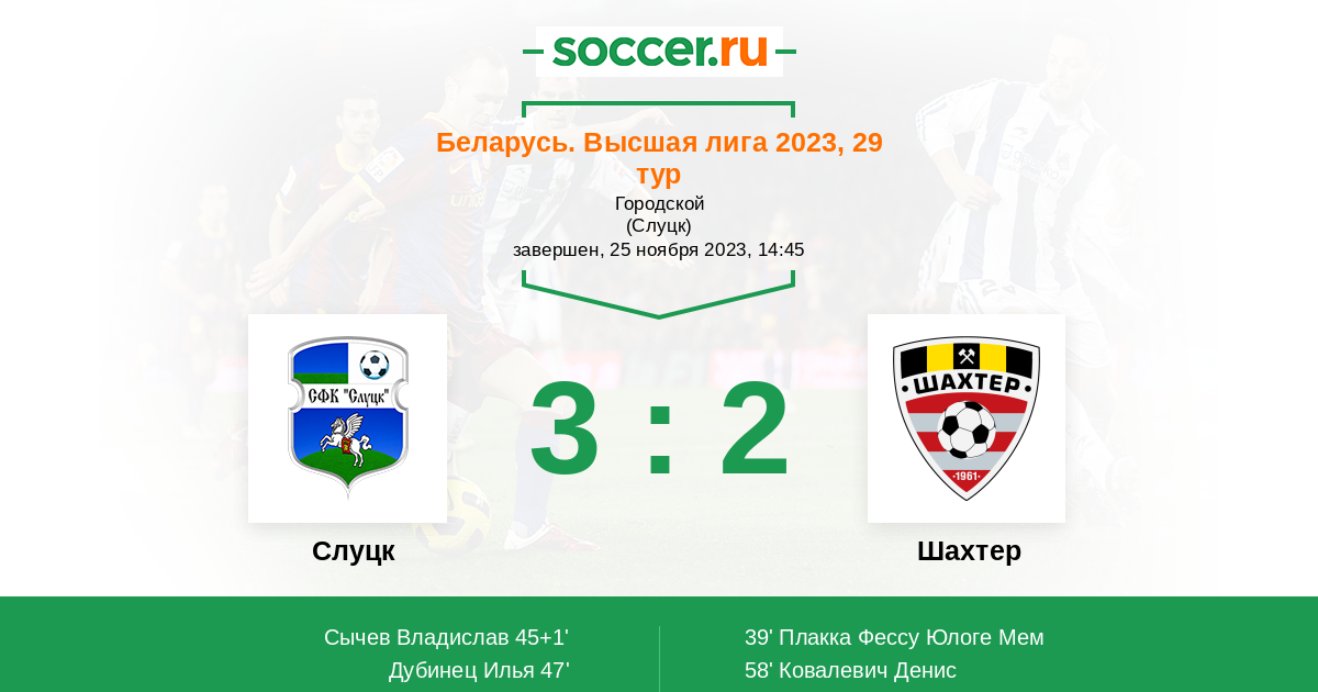 Беларусь. Высшая лига 30.06.2023 Шахтер Логотип футбольный клуб Шахтер (Солигорск) 1:0 Логотип футбольный клуб Слуцк Слуцк