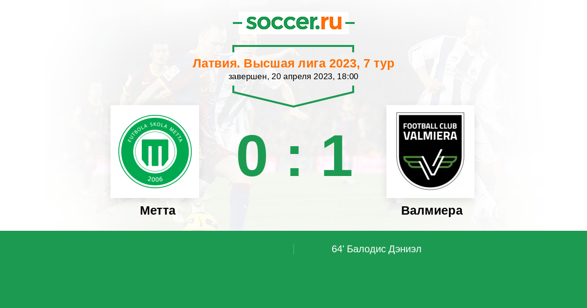 Латвия. Высшая лига 15.05.2022 Метта Логотип футбольный клуб Метта (Рига) 0:3 Логотип футбольный клуб Валмиера (Валмиера Гласс) Валмиера
