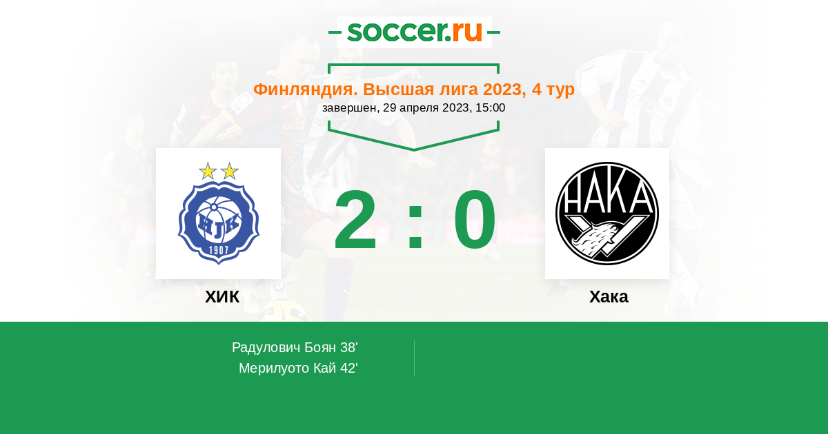 Финляндия. Высшая лига 16.05.2012 Хака Логотип футбольный клуб Хака (Валкеакоски) 0:1 Логотип футбольный клуб ХИК (Хельсинки) ХИК