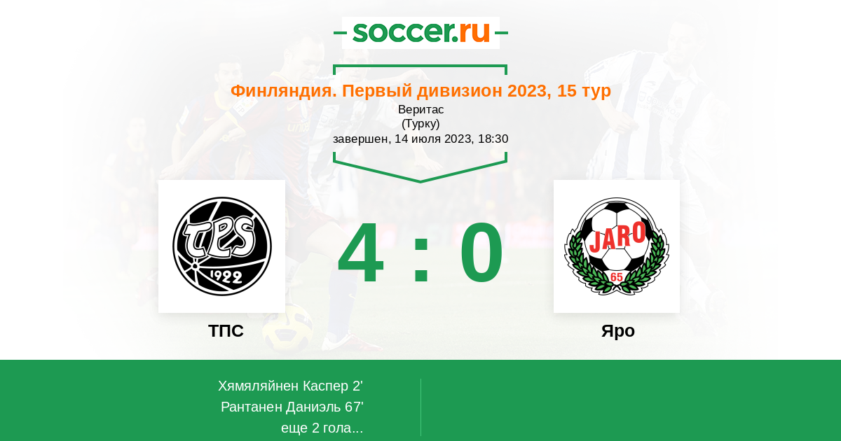 Финляндия. Первый дивизион 24.07.2021 Яро Логотип футбольный клуб Яро (Якобстад) 0:2 Логотип футбольный клуб ТПС (Турку) ТПС