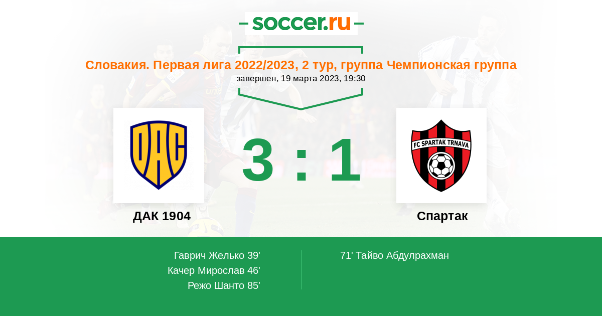 Словакия. Суперлига 20.08.2022 Спартак Логотип футбольный клуб Спартак (Трнава) 3:1 Логотип футбольный клуб ДАК 1904 (Дунайська Стреда) ДАК 1904