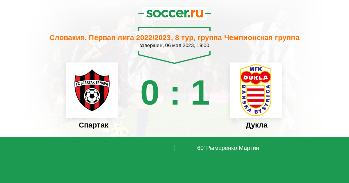 Словакия. Суперлига 08.04.2023 Дукла Логотип футбольный клуб Дукла (Банска-Бистрица) 2:0 Логотип футбольный клуб Спартак (Трнава) Спартак