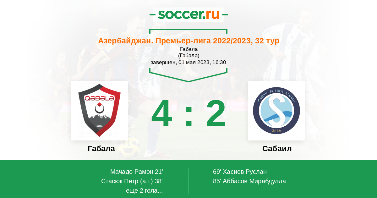 Азербайджан. Премьер-Лига 06.05.2024 Сабаил Логотип футбольный клуб Сабаил (Баку) 2:3 Логотип футбольный клуб Габала Габала