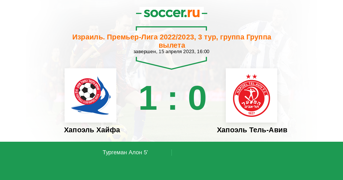 Израиль. Премьер-Лига 11.04.2015 Хапоэль Хайфа Логотип футбольный клуб Хапоэль Хайфа 0:1 Логотип футбольный клуб Хапоэль Тель-Авив Хапоэль Тель-Авив