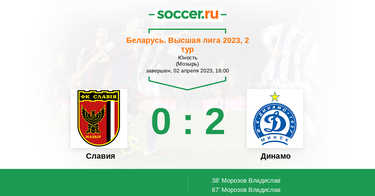 Беларусь. Высшая лига 09.04.2022 Славия Логотип футбольный клуб Славия (Мозырь) 1:2 Логотип футбольный клуб Динамо (Минск) Динамо