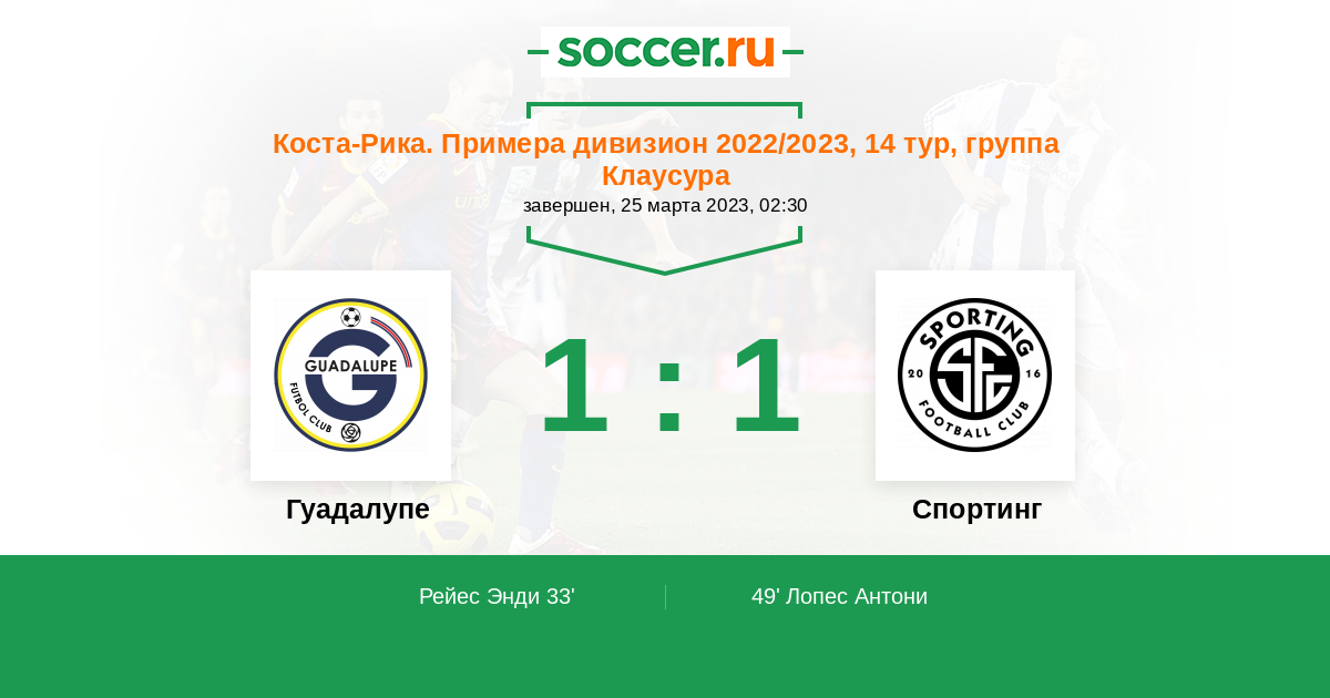 Коста-Рика. Примера дивизион 17.04.2022 Гуадалупе Логотип футбольный клуб Гуадалупе 4:2 Логотип футбольный клуб Спортинг Сан-Хосе Спортинг Сан-Хосе