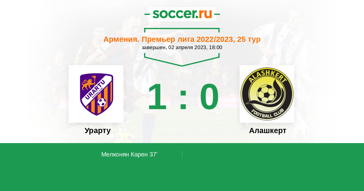 Армения. Премьер-лига 10.04.2019 Урарту Логотип футбольный клуб Урарту (Ереван) 2:0 Логотип футбольный клуб Алашкерт (Мартуни) Алашкерт