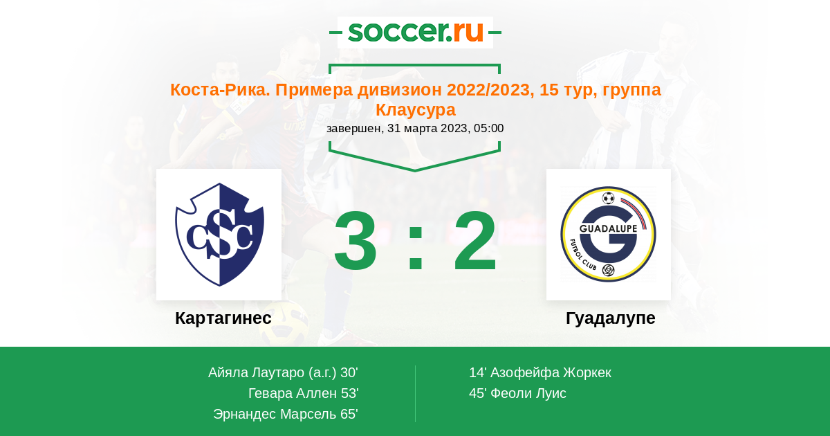 Коста-Рика. Примера дивизион 30.01.2023 Гуадалупе Логотип футбольный клуб Гуадалупе 5:1 Логотип футбольный клуб Картахинес (Карфаген) Картахинес