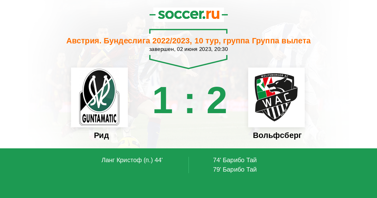 Австрия. Бундеслига 01.04.2023 Вольфсберг Логотип футбольный клуб Вольфсберг 1:0 Логотип футбольный клуб Рид Рид