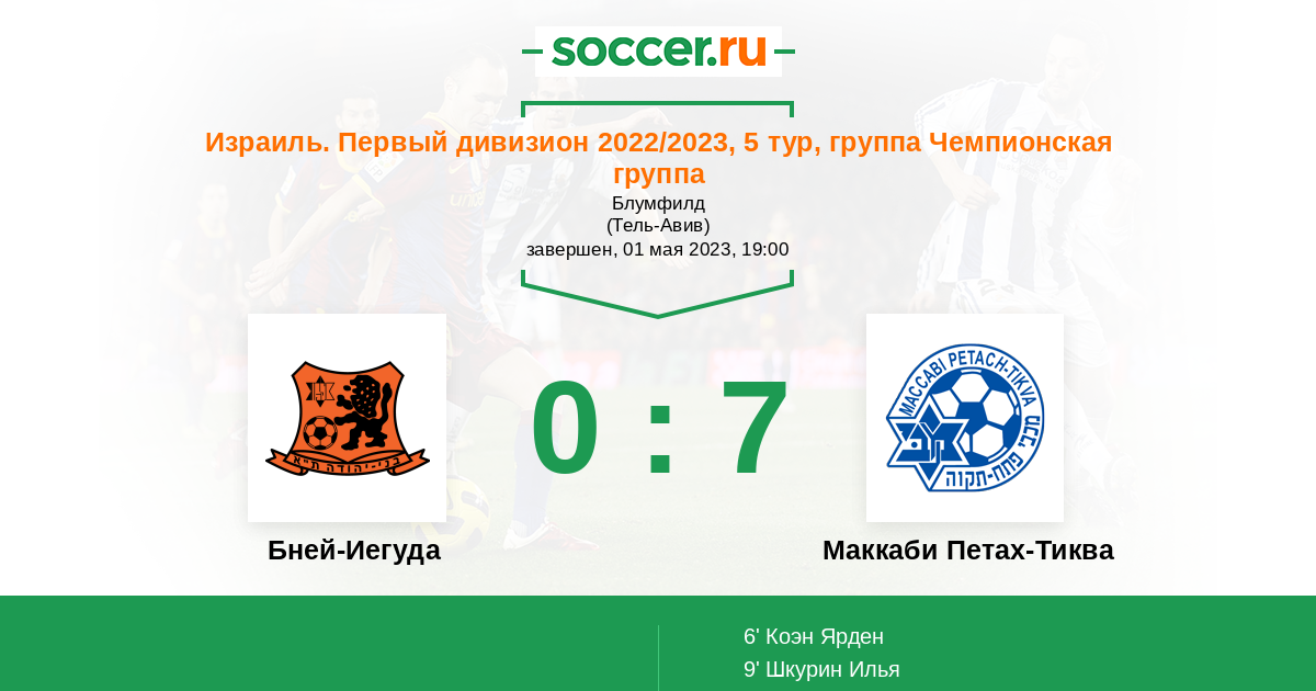 Израиль. Премьер-Лига 05.10.2013 Бней-Иегуда Логотип футбольный клуб Бней-Иегуда (Тель-Авив) 2:4 Логотип футбольный клуб Маккаби Петах-Тиква Маккаби Петах-Тиква