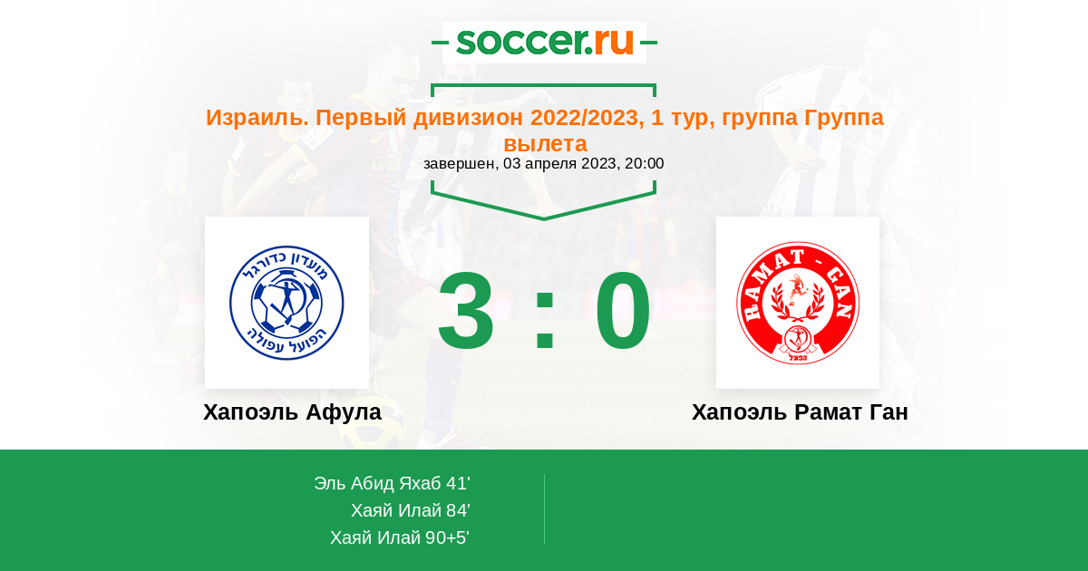 Израиль. Первый дивизион 05.04.2024 Хапоэль Афула Логотип футбольный клуб Хапоэль Афула 2:3 Логотип футбольный клуб Хапоэль Рамат Ган Хапоэль Рамат Ган