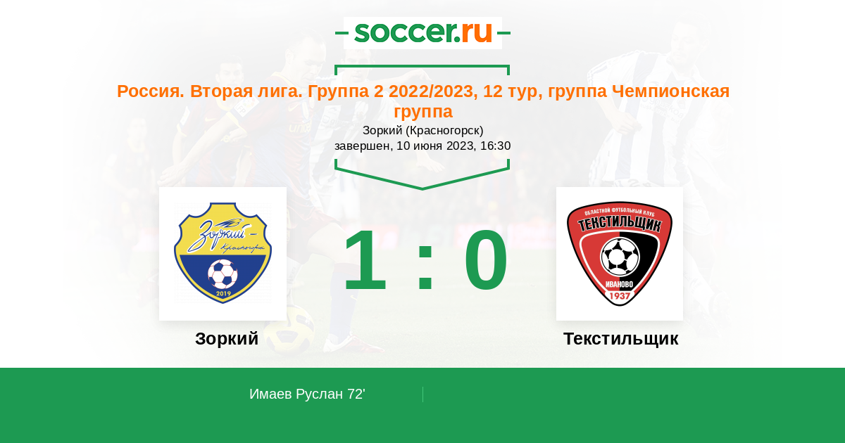 Россия. Вторая лига. Группа 2 02.04.2023 Текстильщик Логотип футбольный клуб Текстильщик (Иваново) 3:0 Логотип футбольный клуб Зоркий (Красногорск) Зоркий