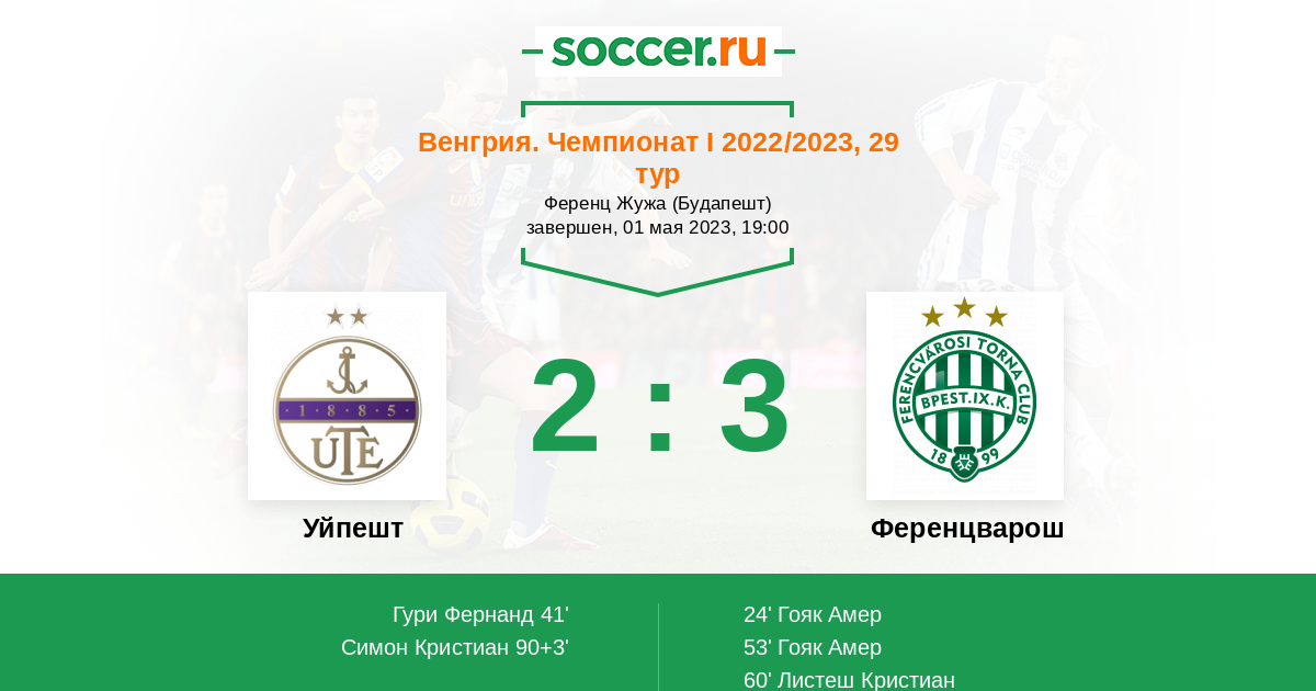 Венгрия. Чемпионат 1 05.02.2023 Ференцварош Логотип футбольный клуб Ференцварош (Будапешт) 3:1 Логотип футбольный клуб Уйпешт (Будапешт) Уйпешт