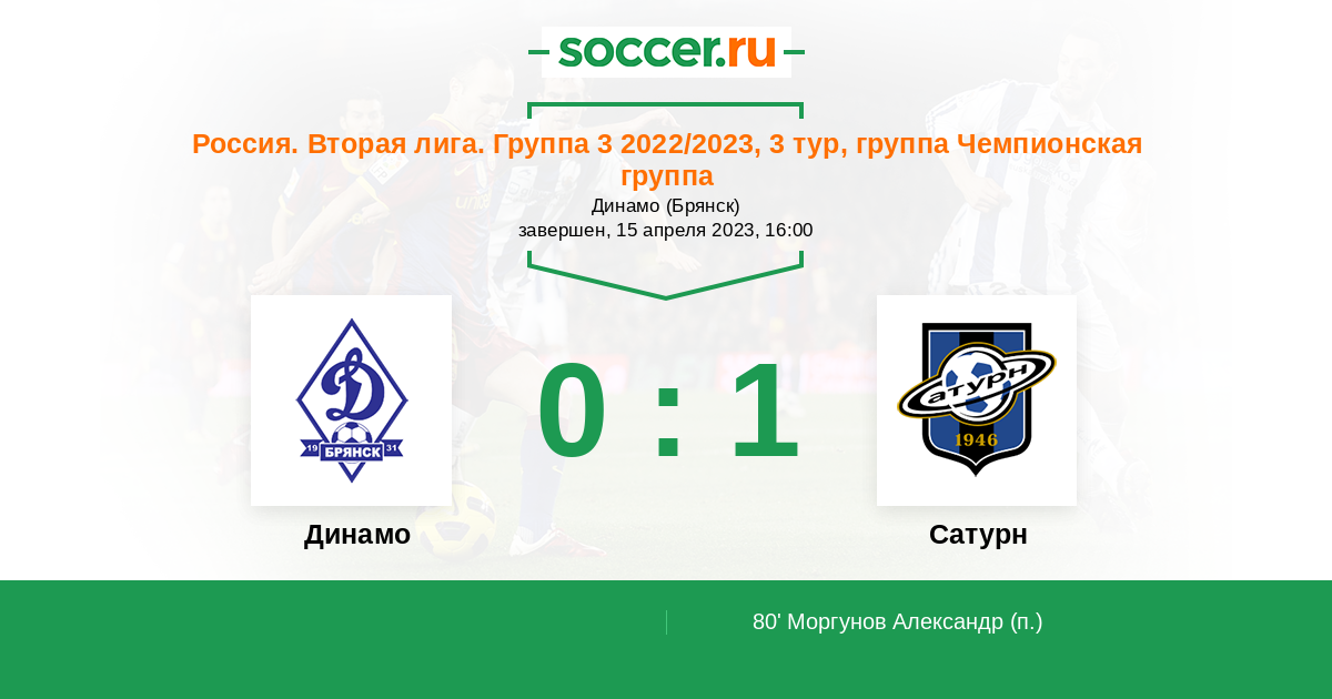 Россия. Вторая лига. Группа 3 15.05.2023 Сатурн Логотип футбольный клуб Сатурн (Раменское) 1:1 Логотип футбольный клуб Динамо Брянск Динамо Брянск