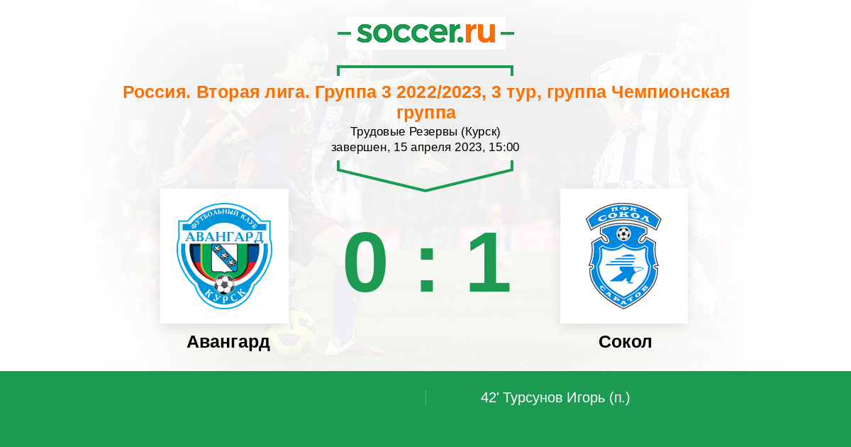 Россия. Вторая лига. Группа 3 15.05.2023 Сокол Логотип футбольный клуб Сокол (Саратов) 1:1 Логотип футбольный клуб Авангард (Курск) Авангард