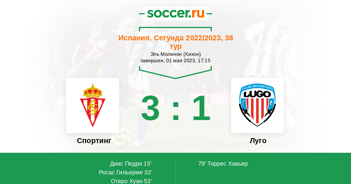 В предстоящем матче 38-го тура испанской Сегунды между командами Реал Спортинг Хихон и Луго Депортиво, явным фаворитом на победу является команда хозяев Реал Спортинг Хихон, так как им нужно выиграть, чтоб обезопасить себя от зоны вылета.