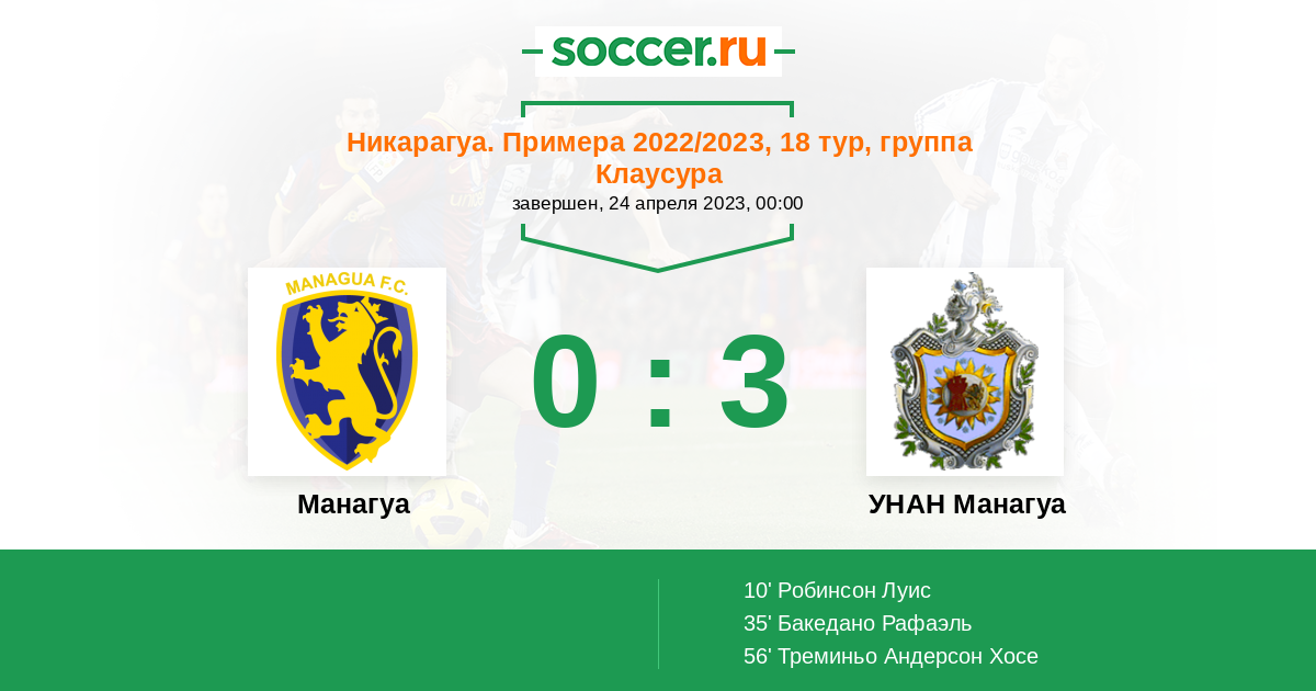 Никарагуа. Примера 05.03.2023 УНАН Манагуа Логотип футбольный клуб УНАН Манагуа 0:2 Логотип футбольный клуб Манагуа Манагуа