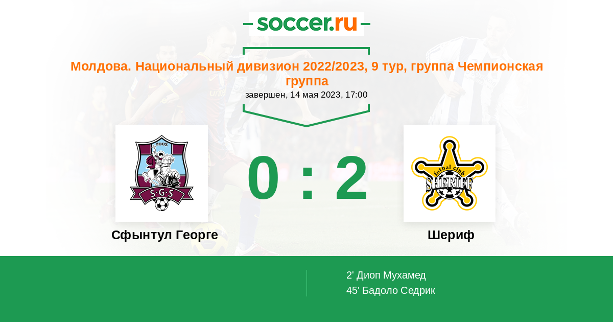 Молдова. Национальный дивизион 09.04.2023 Шериф Логотип футбольный клуб Шериф (Тирасполь) 1:0 Логотип футбольный клуб Сфынтул Георге (Суручены) Сфынтул Георге