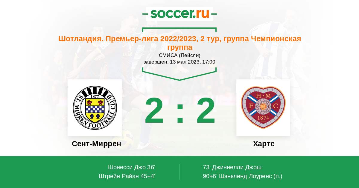 Шотландия. Премьер-Лига 08.04.2023 Хартс Логотип футбольный клуб Хартс (Эдинбург) 0:2 Логотип футбольный клуб Сент-Миррен (Пейсли) Сент-Миррен