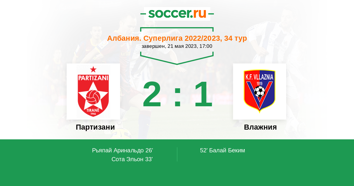 Албания. Суперлига 16.03.2014 Влажния Логотип футбольный клуб Влажния (Шкодер) 0:1 Логотип футбольный клуб Партизани (Тирана) Партизани