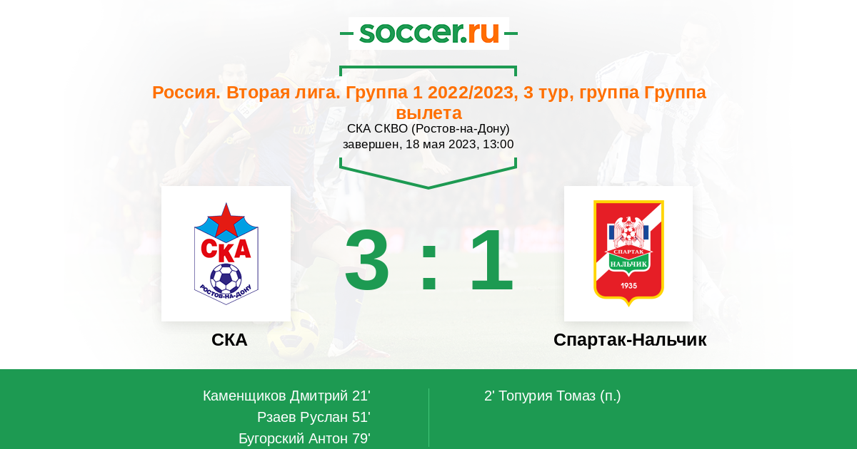 Россия. Вторая лига. Группа 1 31.03.2023 СКА Логотип футбольный клуб СКА (Ростов-на-Дону) 0:2 Логотип футбольный клуб Спартак-Нальчик Спартак-Нальчик
