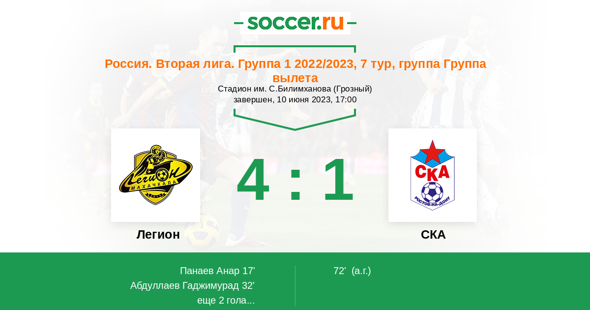 Россия. Вторая лига. Группа 1 04.06.2017 Легион Логотип футбольный клуб Легион (Махачкала) 1:0 Логотип футбольный клуб СКА (Ростов-на-Дону) СКА