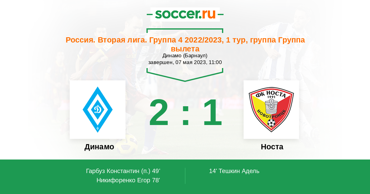 Россия. Вторая лига. Дивизион «Б». Группа 4 22.10.2023 Носта Логотип футбольный клуб Носта (Новотроицк) 3:2 Логотип футбольный клуб Динамо Барнаул Динамо Барнаул
