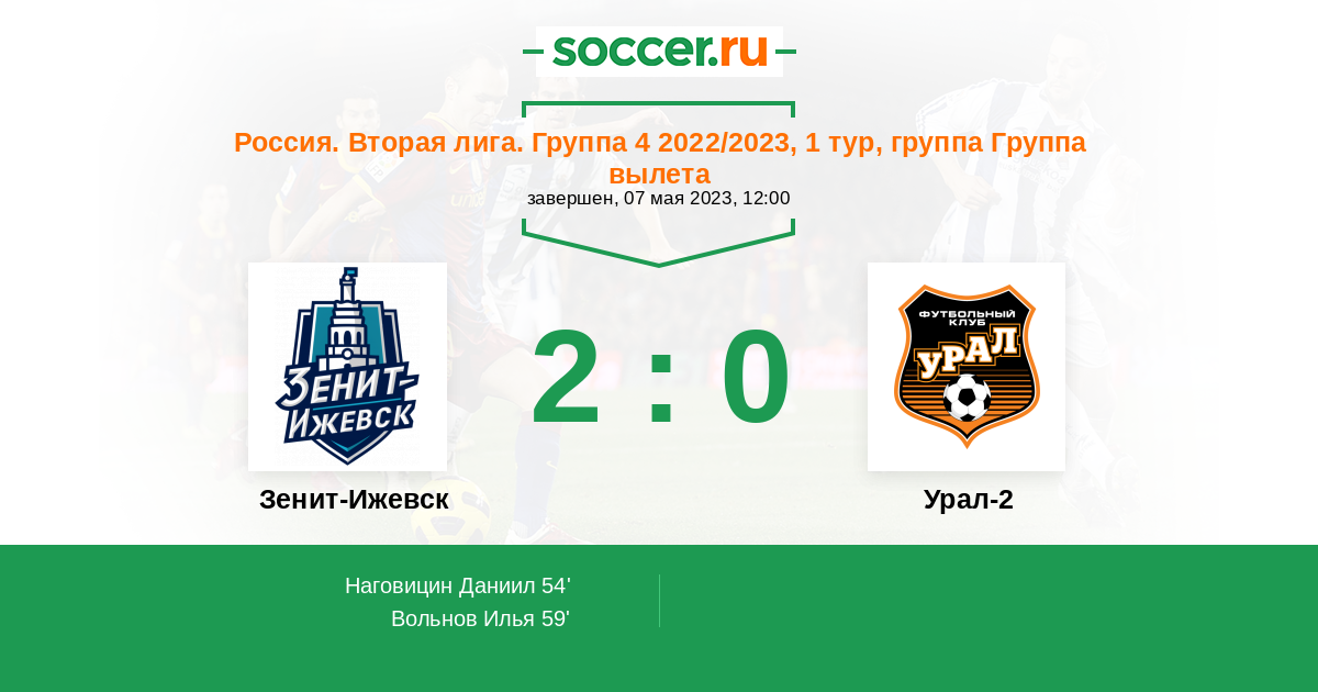 Россия. Вторая лига. Группа 4 07.05.2023 Зенит-Ижевск Логотип футбольный клуб Зенит-Ижевск 2:0 Логотип футбольный клуб Урал-2 (Екатеринбург) Урал-2