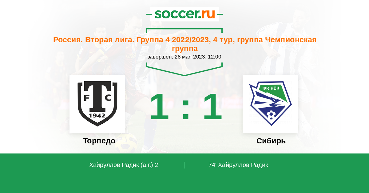 Россия. Вторая лига. Группа 4 30.04.2022 Сибирь Логотип футбольный клуб Сибирь (Новосибирск) 0:0 Логотип футбольный клуб Торпедо (Миасс) Торпедо
