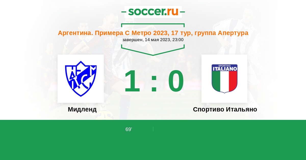 Аргентина. Примера С Метро 25.09.2017 Мидленд Логотип футбольный клуб Мидленд (Либертад) 1:0 Логотип футбольный клуб Спортиво Итальяно (Буэнос-Айрес) Спортиво Итальяно