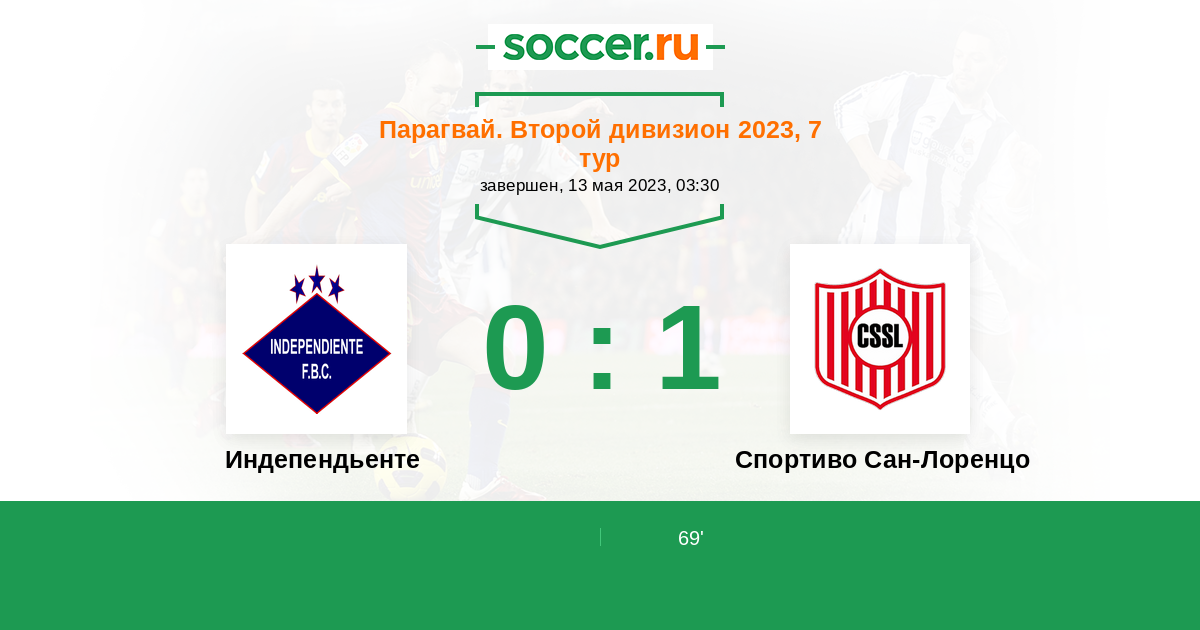 Парагвай. Второй дивизион 19.08.2023 Спортиво Сан-Лоренцо Логотип футбольный клуб Спортиво Сан-Лоренцо 0:2 Логотип футбольный клуб Индепендьенте (Луке) Индепендьенте