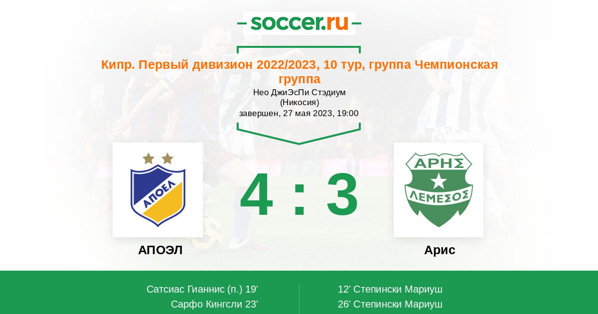 Кипр. Первый Дивизион 17.04.2022 Арис Логотип футбольный клуб Арис (Лимассол) 1:2 Логотип футбольный клуб АПОЭЛ (Никосия) АПОЭЛ