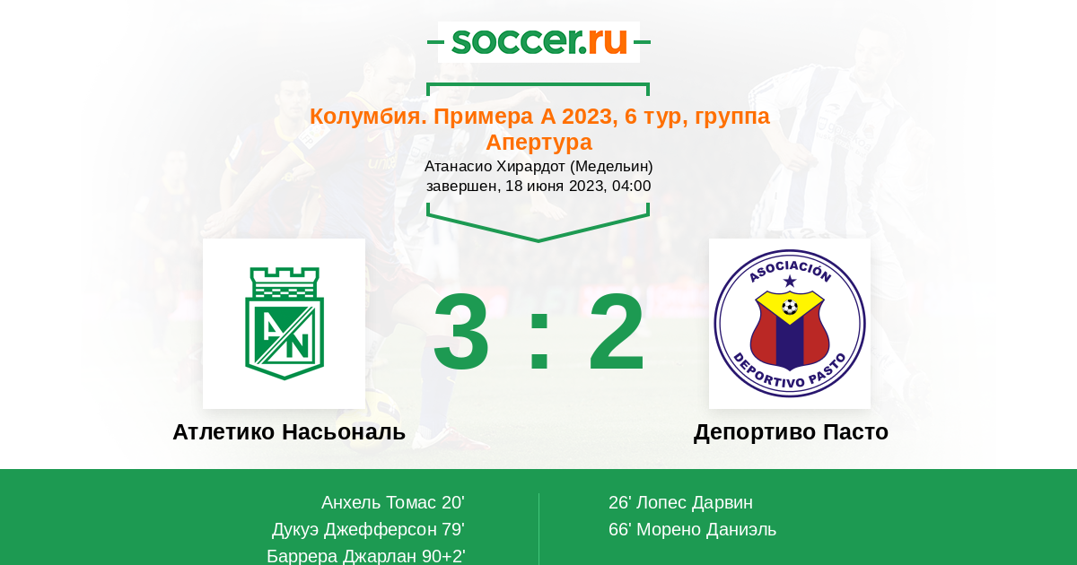 Колумбия. Примера А 06.03.2023 Депортиво Пасто Логотип футбольный клуб Депортиво Пасто 0:1 Логотип футбольный клуб Атлетико Насьональ (Медельин) Атлетико Насьональ