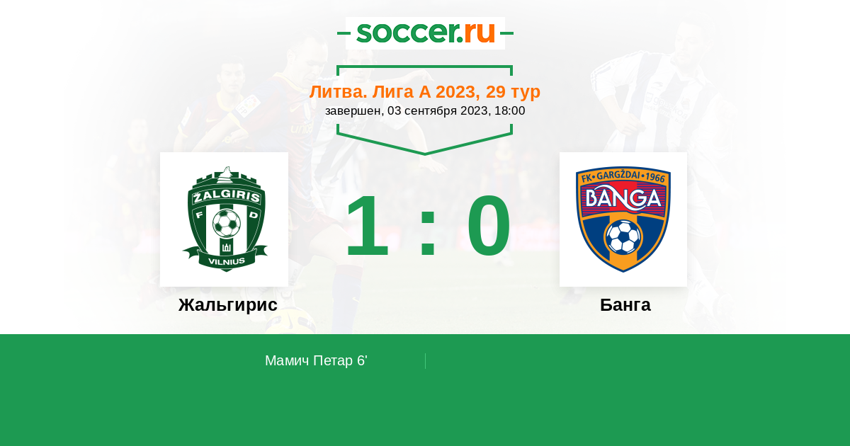 Литва. Лига А 17.09.2014 Банга Логотип футбольный клуб Банга (Гаргждай) 1:5 Логотип футбольный клуб Жальгирис (Вильнюс) Жальгирис