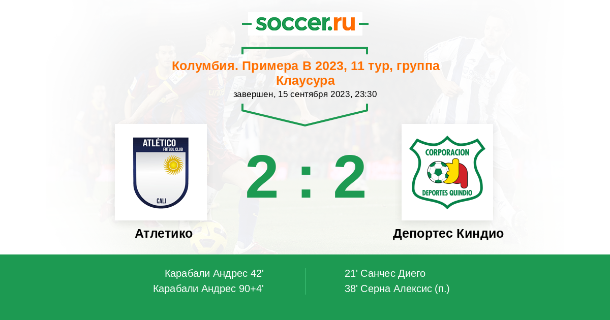 Колумбия. Примера B 11.04.2023 Депортес Киндио Логотип футбольный клуб Депортес Киндио (Армения) 4:2 Логотип футбольный клуб Атлетико Кали Атлетико Кали
