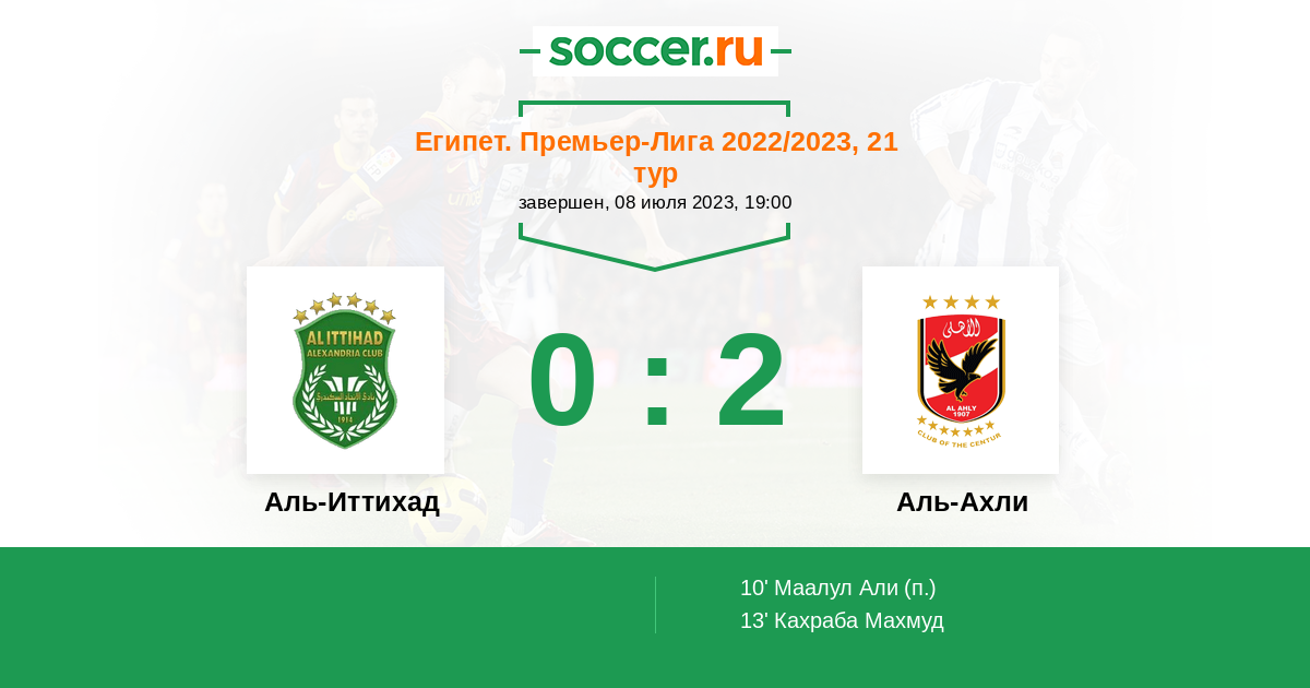 Египет. Премьер-Лига 18.06.2024 Аль-Иттихад Логотип футбольный клуб Аль-Иттихад (Александрия) 0:1 Логотип футбольный клуб Аль-Ахли (Каир) Аль-Ахли