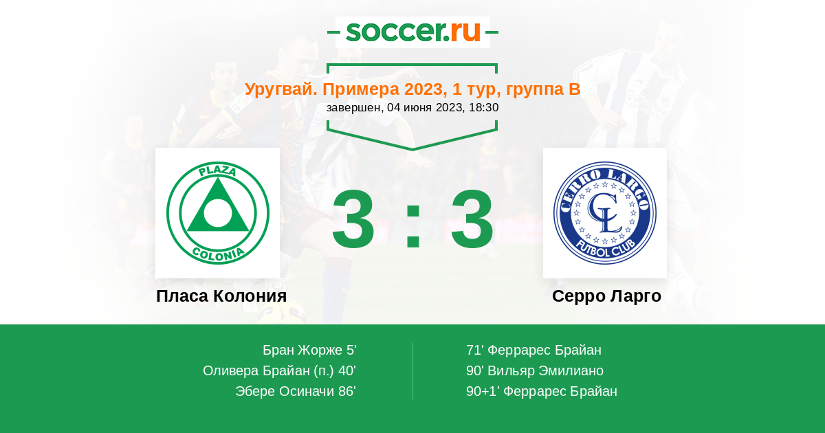 Уругвай. Примера A 16.04.2023 Пласа Колония Логотип футбольный клуб Пласа Колония (Колония-дель-Сакраменто) 2:0 Логотип футбольный клуб Серро Ларго (Мело) Серро Ларго