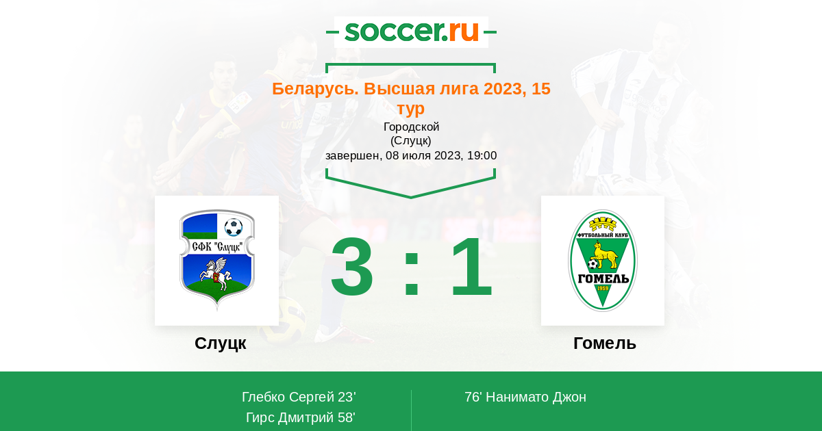 Беларусь. Высшая лига 13.07.2018 Слуцк Логотип футбольный клуб Слуцк 0:1 Логотип футбольный клуб Гомель Гомель